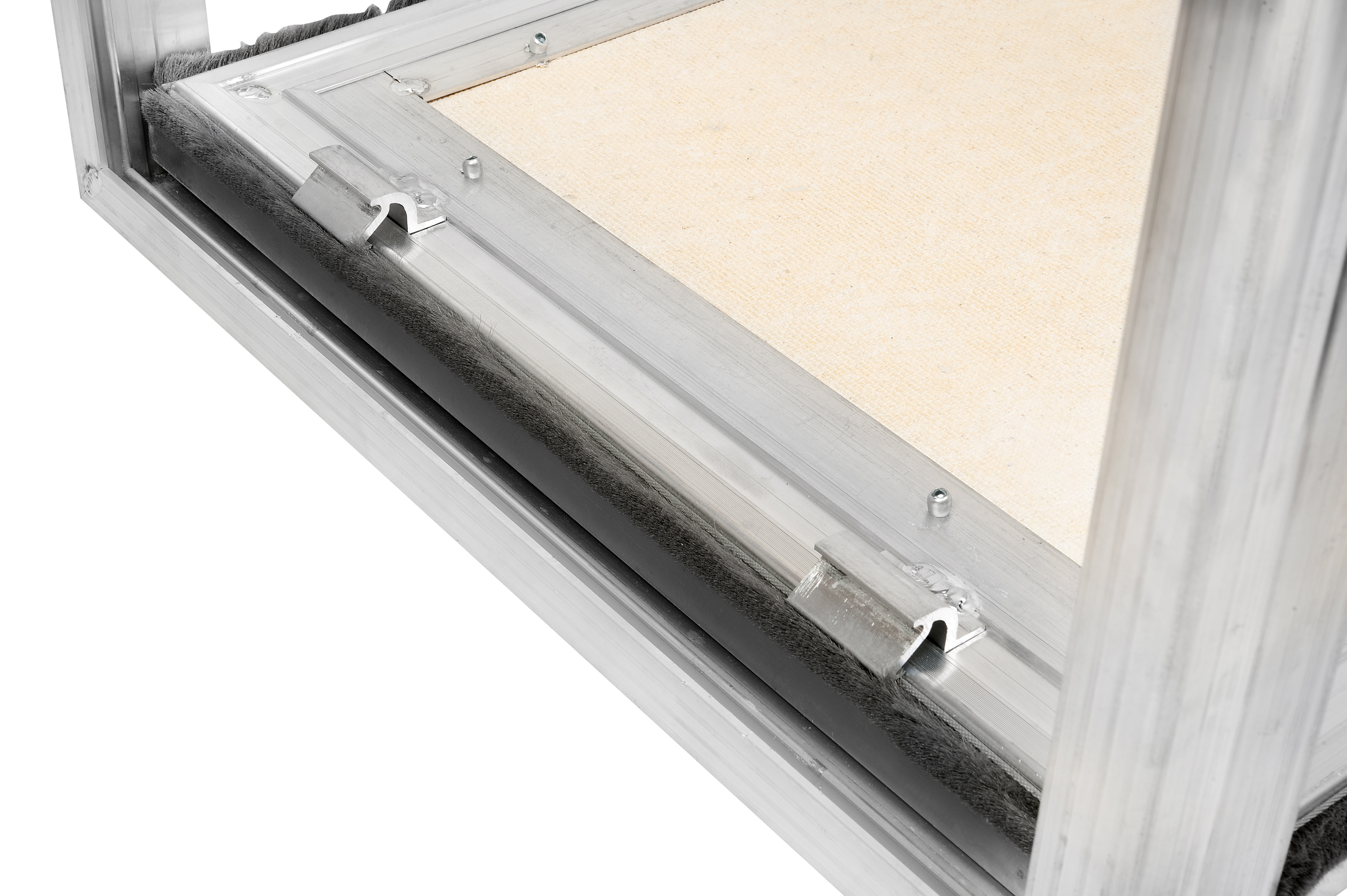 Алюминиевый профиль специальной формы, переменного сечения, разработанный специалистами нашей компании, делает данную конструкцию прочной и надежной в эксплуатации. Щеточный уплотнитель, вклеенный в дверцу, в специальный хвостовик, защищает от пыли. Рамка дверцы из алюминиевого профиля люка модели «Вектор Про Кант» по умолчанию заполняется ГВЛ толщиной 10 мм. При необходимости, по желанию заказчика или особенности отделки модели, возможны следующие изменения и дополнения в конструкцию люка: